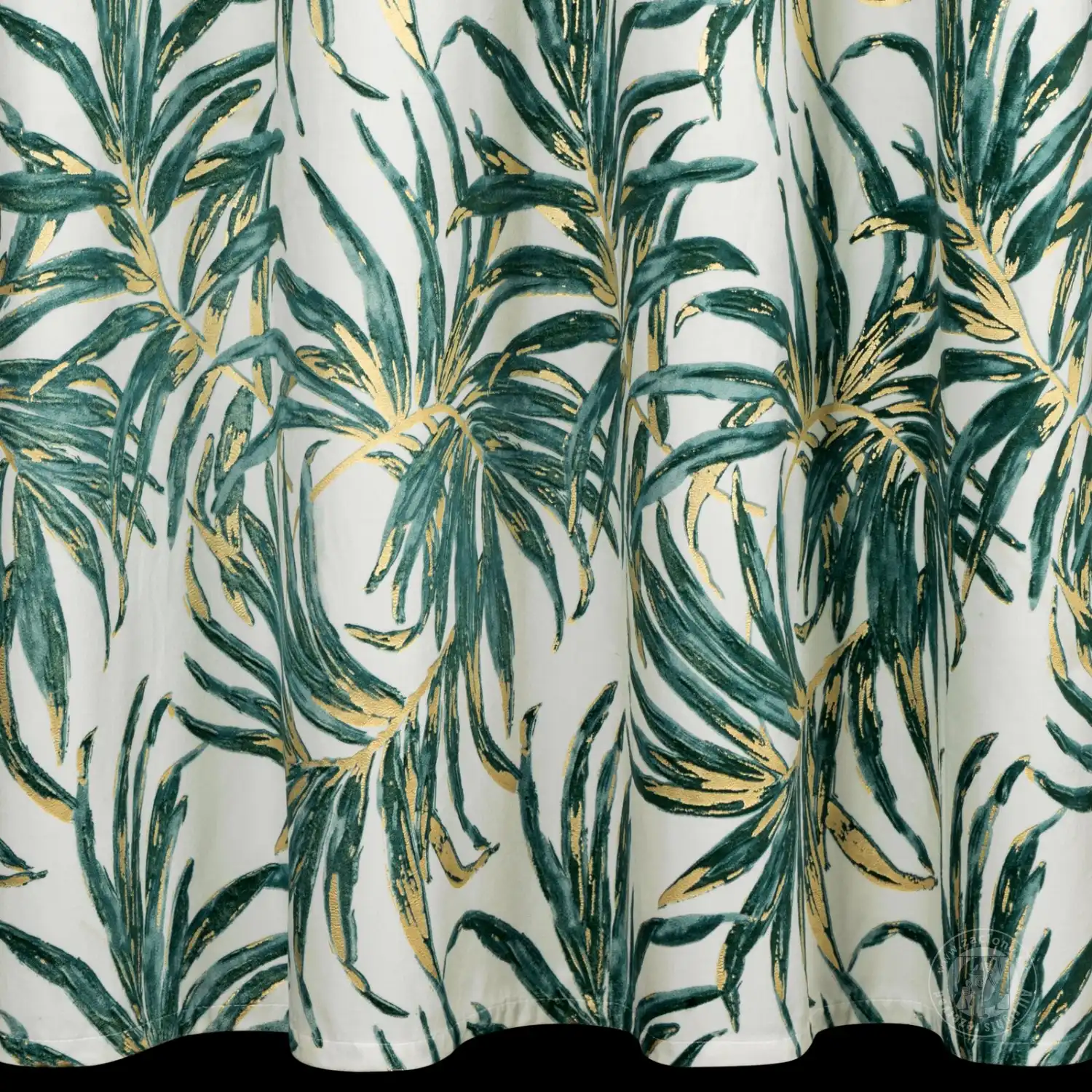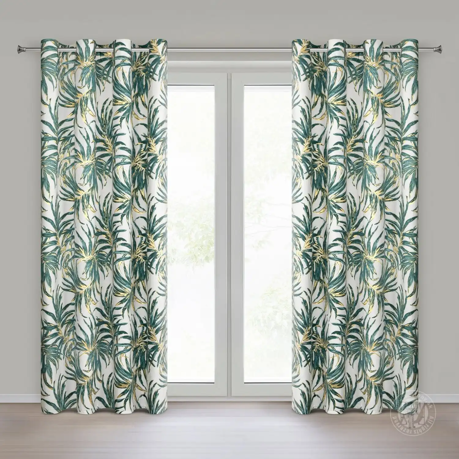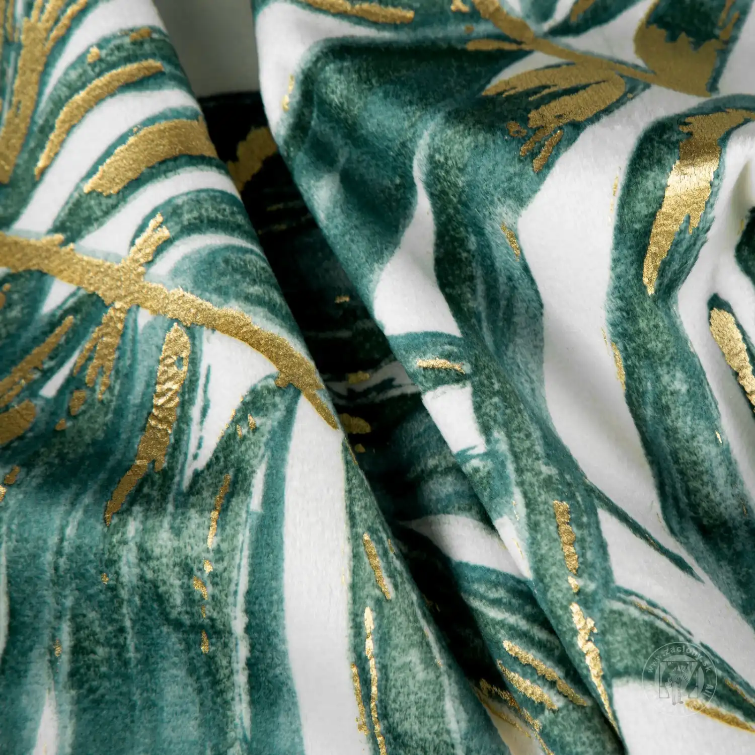 Luxusný zamatový záves obmedzuje svetlo a zaisťuje pohodlie v spálni alebo obývačke. Je zdobený výraznou potlačou exotických listov. Jeho výrazné vzory sú doplnené trblietavými zlatými kontúrami, ktoré krásne odrážajú svetlo. Praktické očká umožňujú rýchle a jednoduché zavesenie záclony a výsledný efekt je esteticky príjemný a moderný.