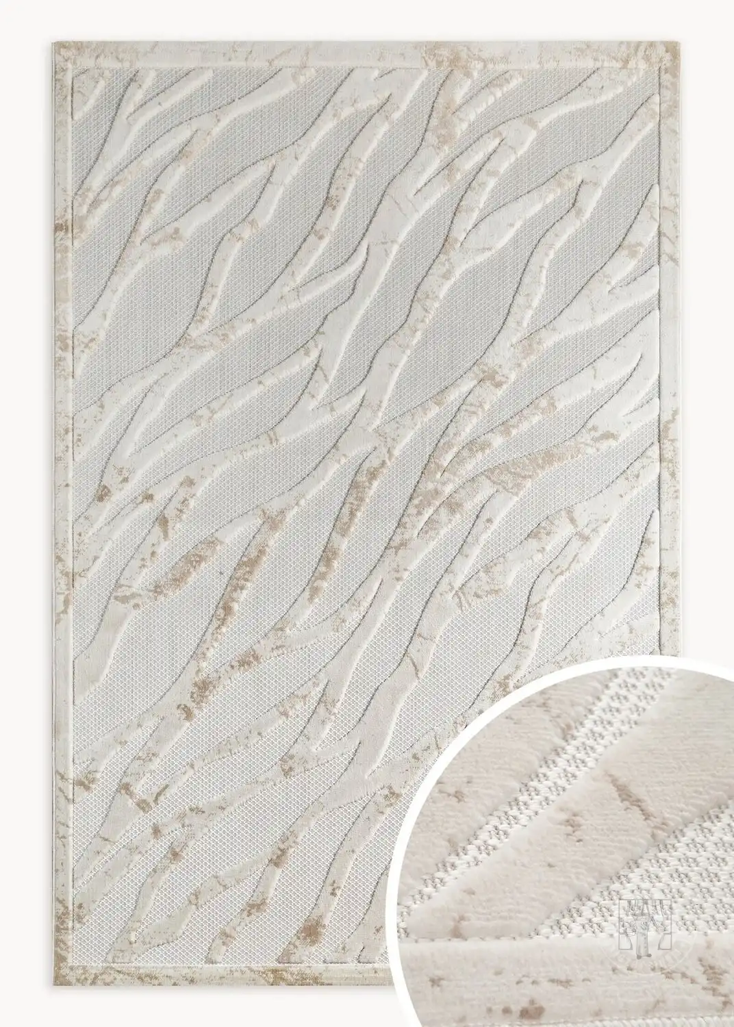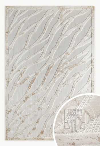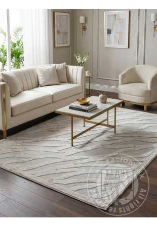 Tento koberec zaujme svojou jemnou, prírodou inšpirovanou kompozíciou. Jeho povrch zdobia jemné, zvlnené línie pripomínajúce plážový piesok alebo jemné ťahy štetcom.