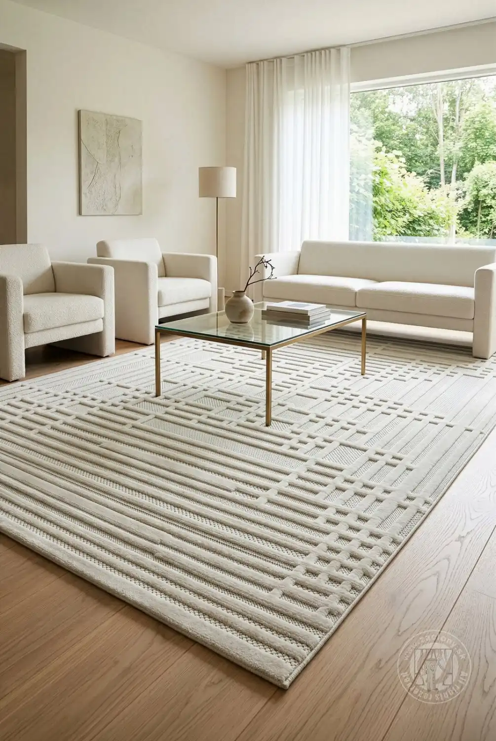 Svetlé farby – krémová, béžová a jemné sivé – dodávajú interiéru ľahkosť a harmóniu a vytvárajú dokonalé pozadie pre moderný a minimalistický dizajn. Koberec krásne presvetľuje miestnosť bez toho, aby dominoval dekoru.