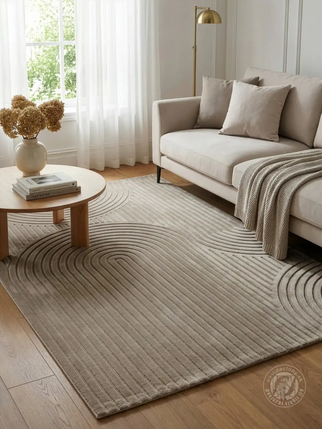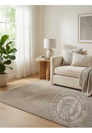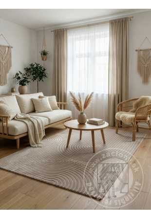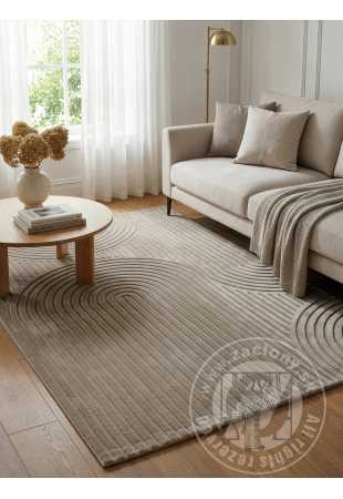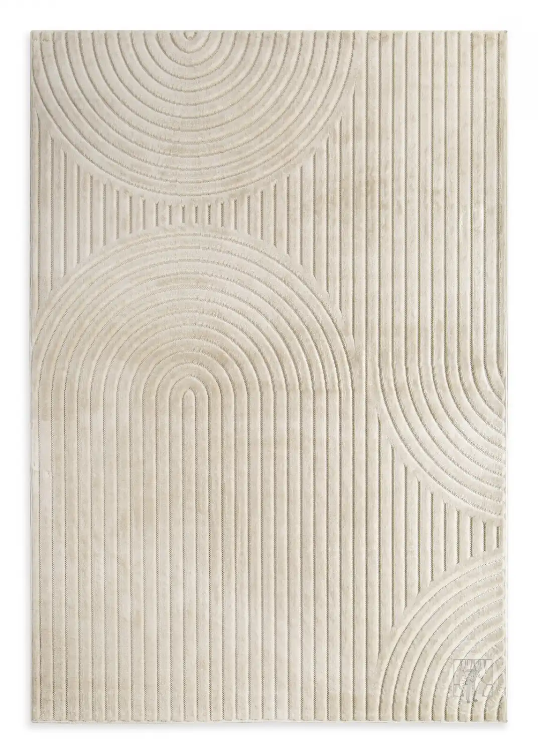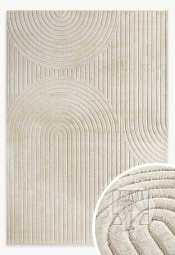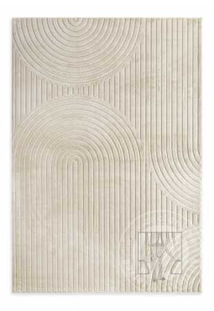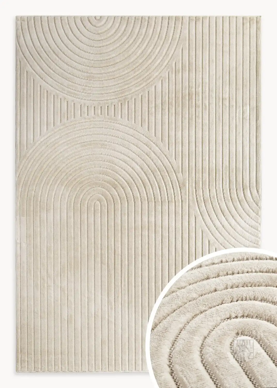 Moderný koberec vyrobený výlučne z polypropylénu, pokrytý výrazným reliéfnym 3D vzorom v podobe harmonických geometrických oblúkov. Vzor je vytvorený rôznymi výškami vlasu – čiary sú mierne znížené a husto tkané, zatiaľ čo oblasti medzi nimi majú mäkkú, nadýchanú textúru.