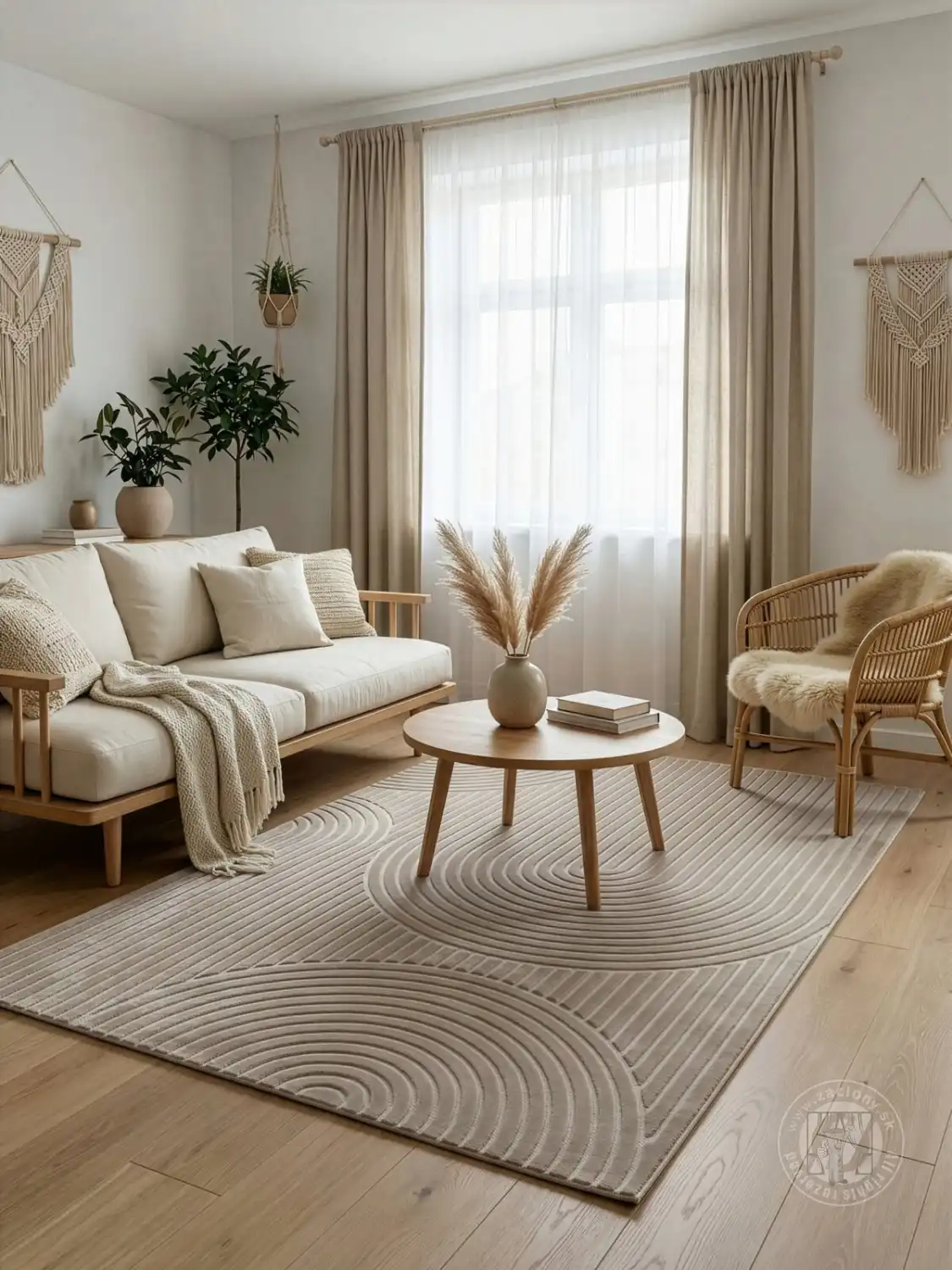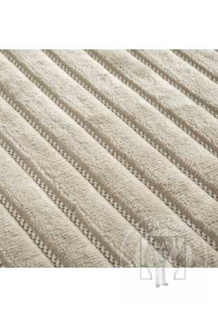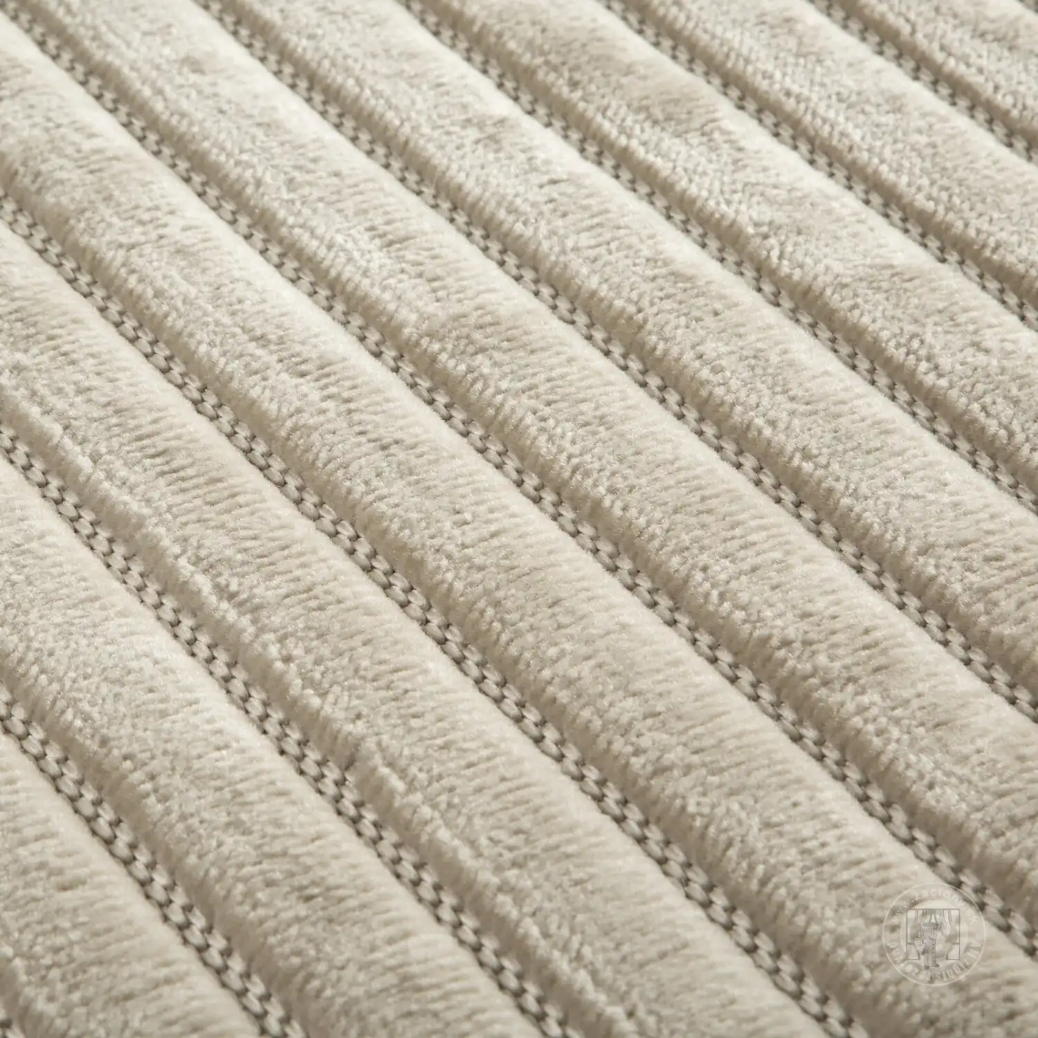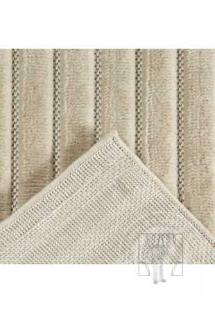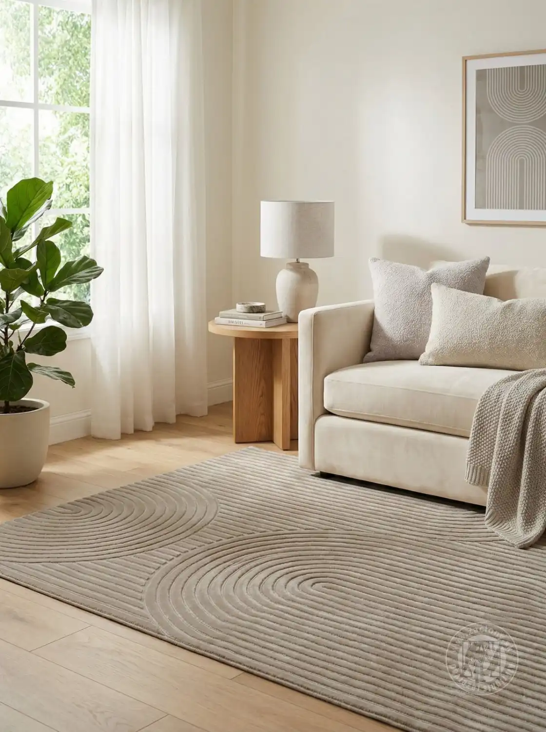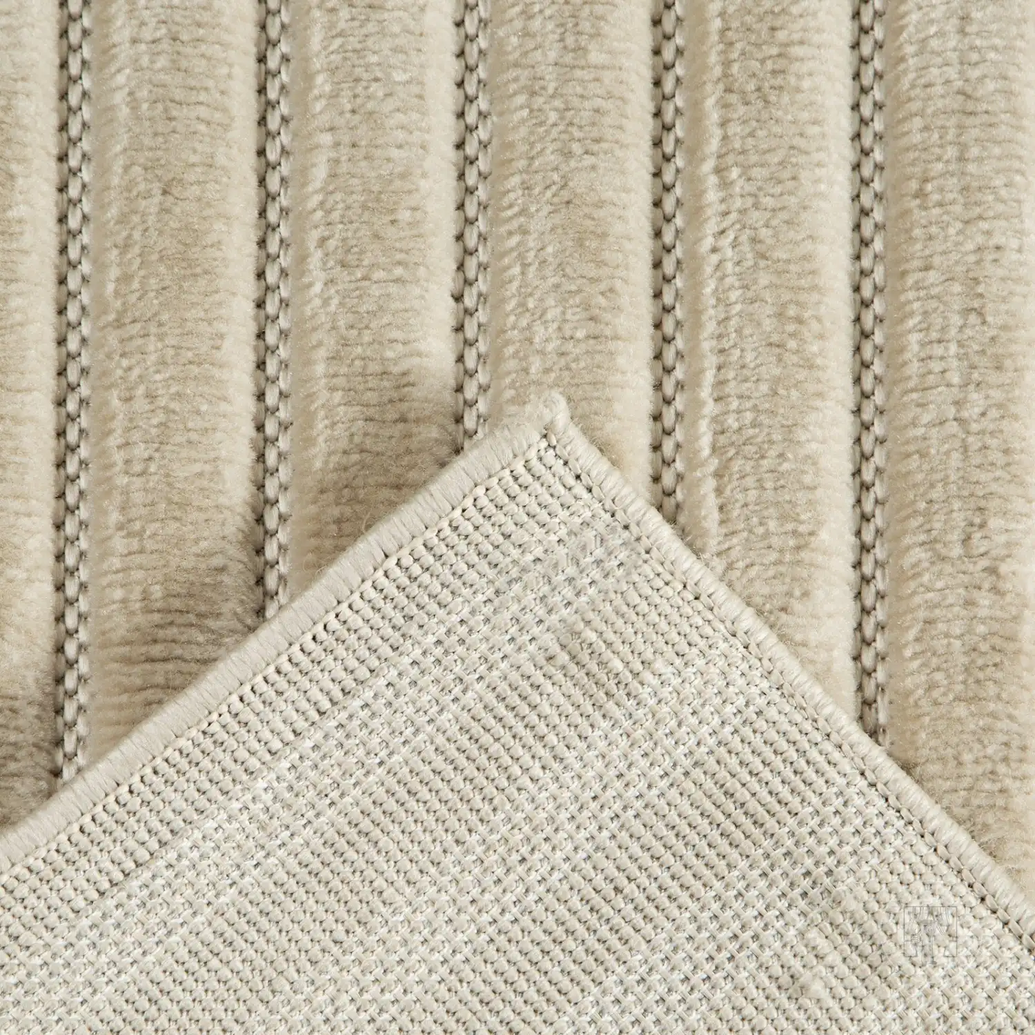 Moderný koberec vyrobený výlučne z polypropylénu, pokrytý výrazným reliéfnym 3D vzorom v podobe harmonických geometrických oblúkov. Vzor je vytvorený rôznymi výškami vlasu – čiary sú mierne znížené a husto tkané, zatiaľ čo oblasti medzi nimi majú mäkkú, nadýchanú textúru.