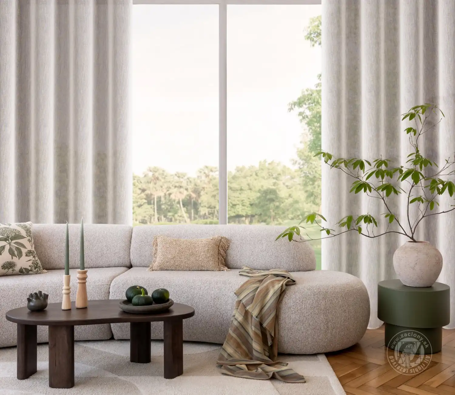Hotový záves ANGELICA je vyrobený z ľahkej látky, ktorá jemne prepúšťa svetlo a dodáva každej miestnosti nádych ľahkosti a útulnosti. Látka sa vyznačuje jemným vzorom „dažďa“ – jemné, zvislé čiary rozložené po látke, ktoré závesu dodávajú elegantný, mierne trblietavý efekt.