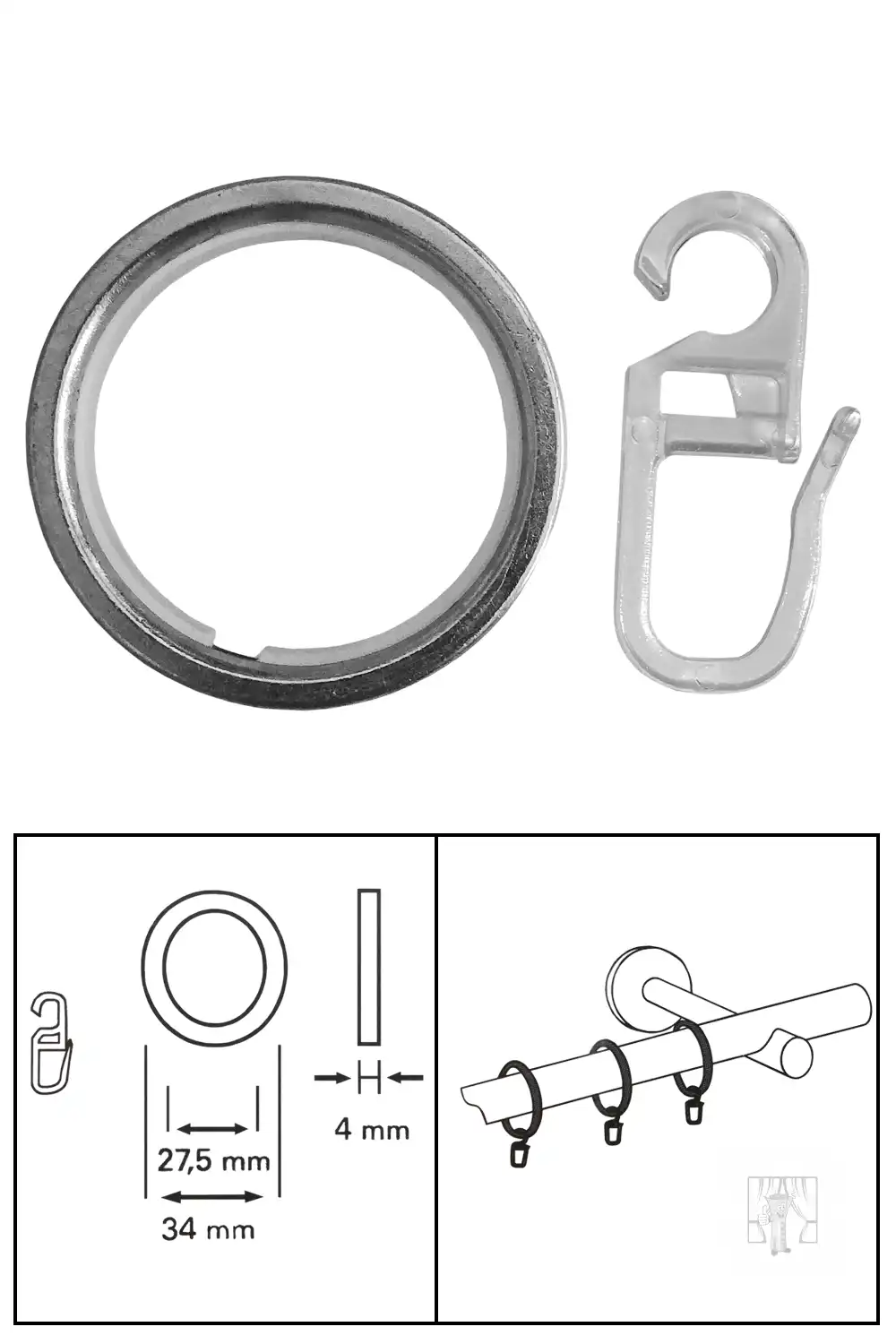 Závesné krúžky na garnižu o priemere do 20 mm, s plastovými háčikmi. Balenie 10 ks.