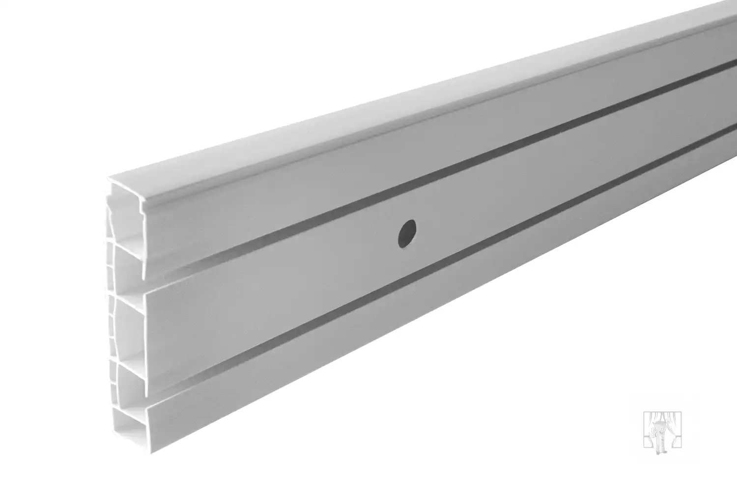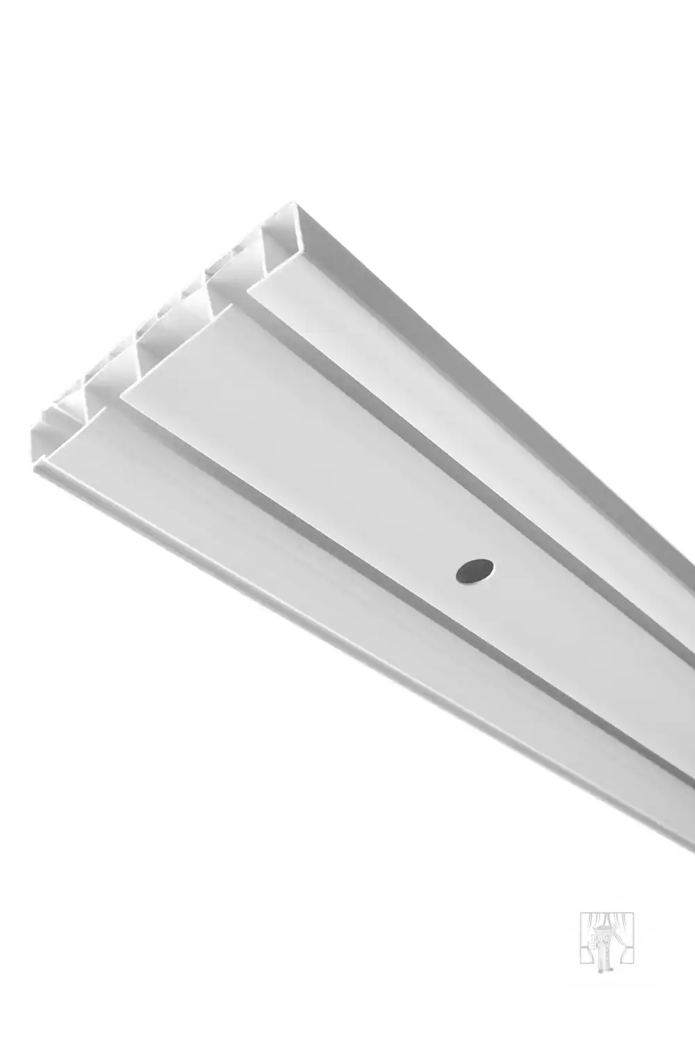 Biela plastová koľajnica, 2-drážková (koľajová), bez príslušenstva a štipcov. Koľajnica má predvŕtané otvory pre stropnú montáž. Tento model má na jednej strane zámok pre upevnenie krycej dekoračnej lišty.