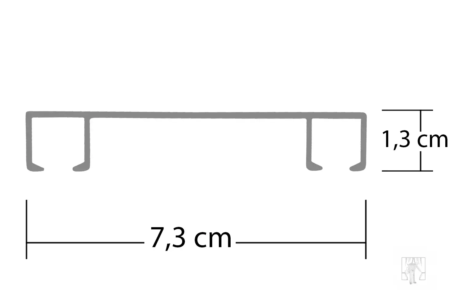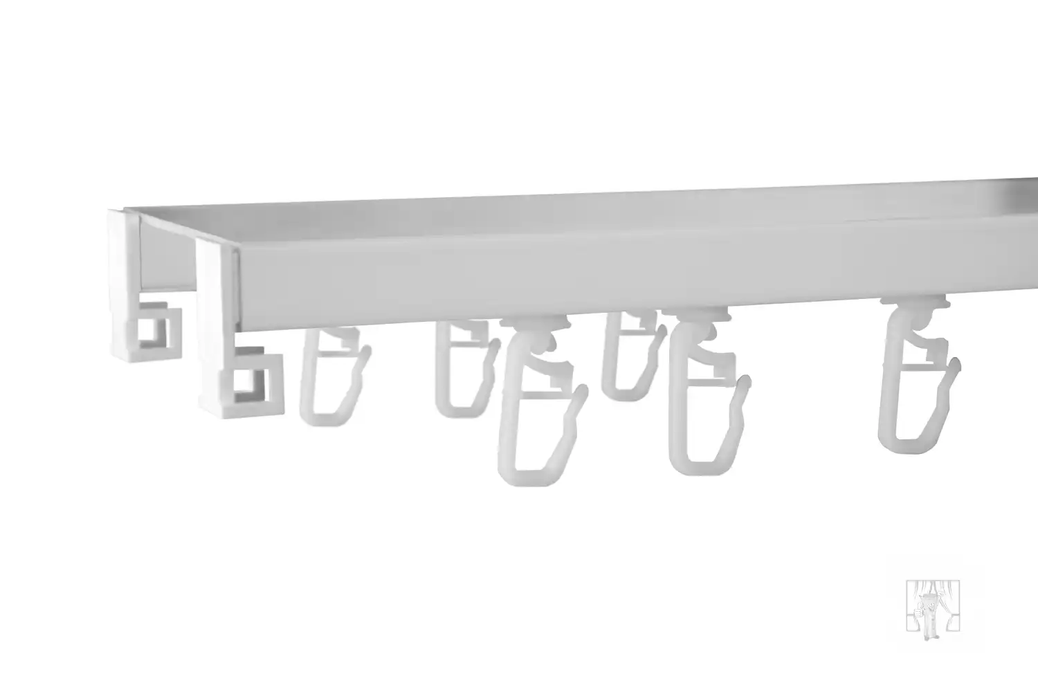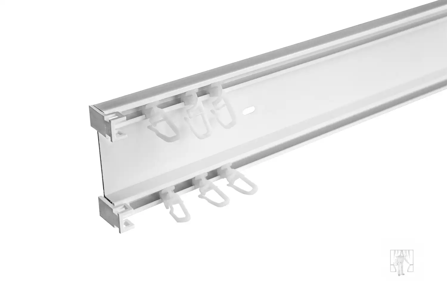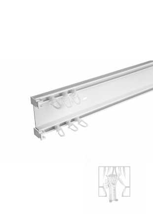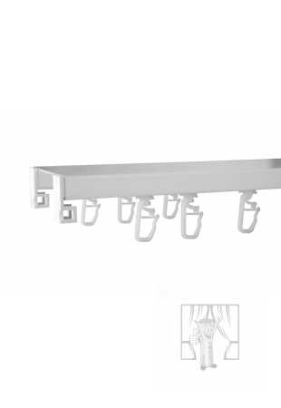 Hliníková koľajnica na závesy a záclony dvojradová – Veľmi pevný koľajnicový systém s dvoma drážkami, ktorý je vhodný na záclonu a záves zároveň na jednej koľajnici. V prednej drážke je možné zavesiť záves, resp. záclonu tak, že koľajnica sa schová za riasiacu pásku a záves v zatiahnutom stave úplne schová koľajnicu.