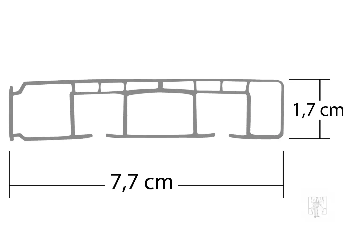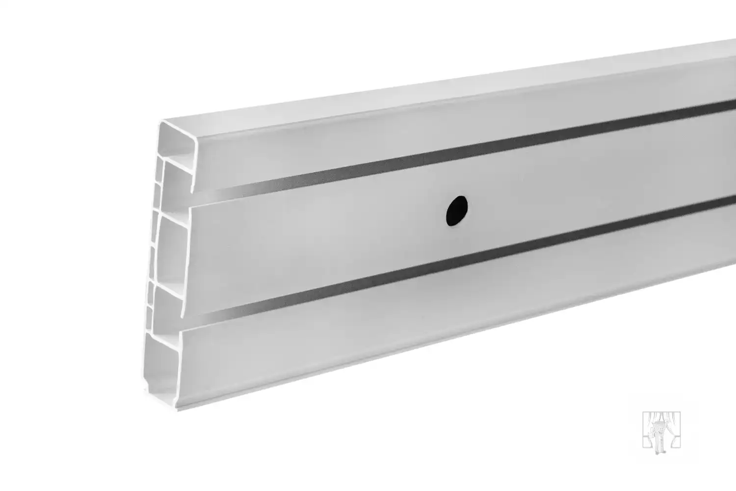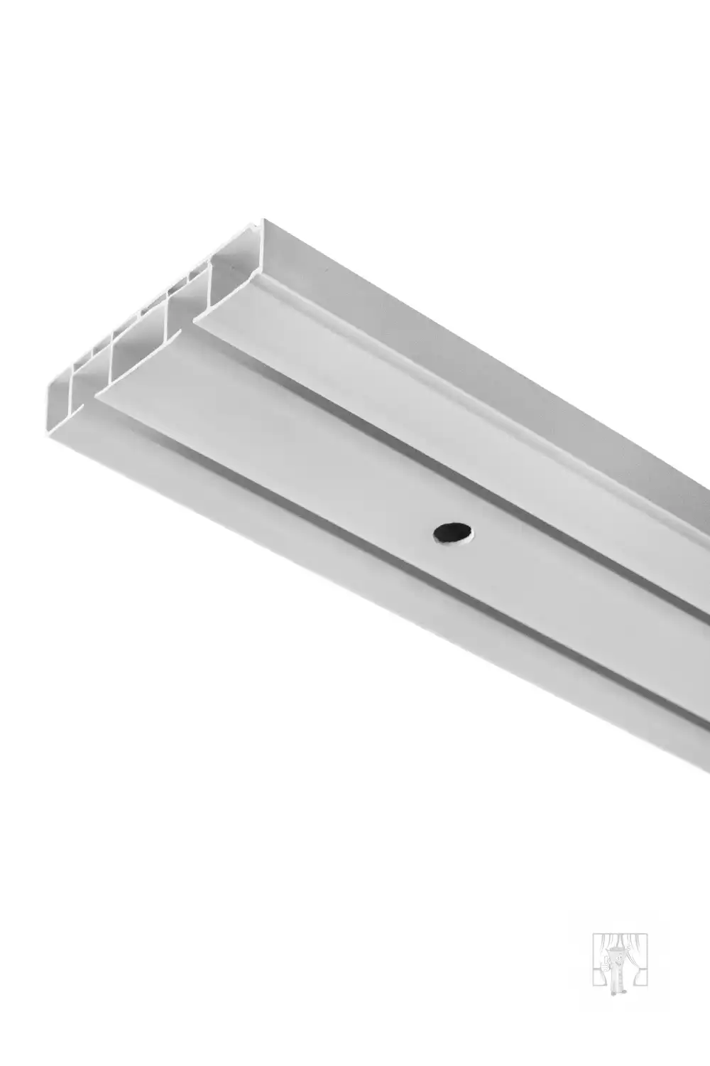 Biela plastová koľajnica, 2-drážková (koľajová), s príslušenstvom. Koľajnica má predvŕtané otvory pre stropnú montáž. Tento model má na jednej strane zámok pre upevnenie krycej dekoračnej lišty. Profil sa dá jednoducho skrátiť zrezaním alebo predĺžiť spojením ďalšou koľajnicou pomocou spojky.