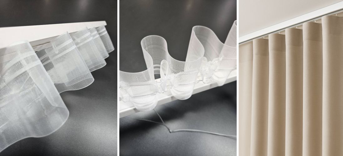 - Príklad: 300 cm látky → výsledná šírka po nariasení cca 150 cm.